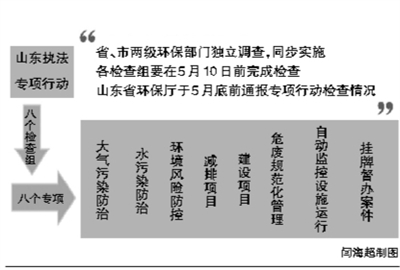 本次專項行動中,省、市兩級環保部門將堅持 立調查的方式,同步組織實施。其中,山東省環保廳派出8組檢查隊伍,分別針對大氣污染防治、水污染防治、環境風險防控等8個重點開展專項檢查。