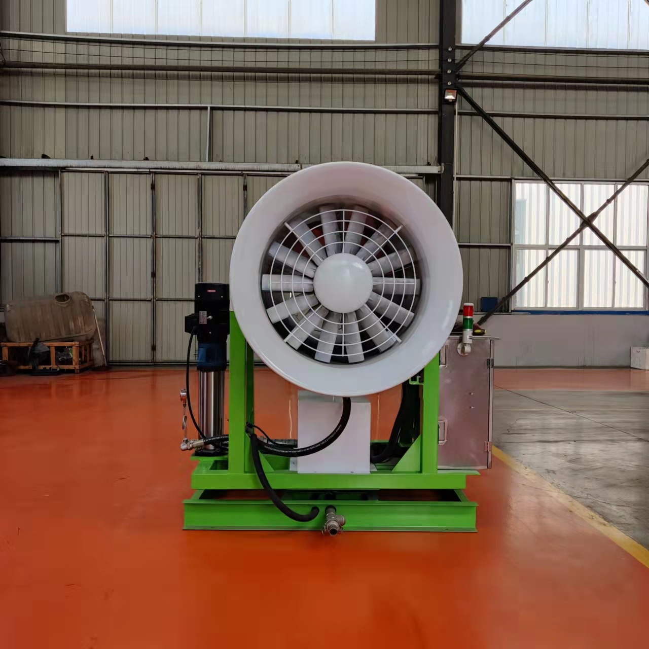 風送式霧炮機能有 效控制粉塵,降低粉塵濃度,改 善工作環境預 防工礦事故,對促 進 安 全生產,保障職工身體健康,維護環境衛生等具有重要作用。風送式霧炮機是有葉輪、風筒、后導流器、噴霧裝置以及支架等部分組成的,采用了新型葉輪,高性能后導流器和新型電機支持結構,風機效率比較高,成霧也很穩定,霧量調節范圍比較大,霧滴直徑 均勻,操作簡單方便,使用壽命較長。采用 的噴霧重力降塵技術,通過高壓將水霧化成與粉塵大小相當的顆粒,在風機作用下,將水霧拋射到遠方,在塵源處的上方或周邊進行噴霧覆蓋。塵埃顆粒與水珠顆粒產生接觸而變得濕潤,被濕潤的粉塵顆粒繼續吸附其它粉塵顆粒,逐漸凝結成顆粒團,并在自身的重力作用下而沉降,雙而達到快速將粉塵抑制降沉的目的。該機是我廠 設計,吸取國內外 技術,根據 環 保、除塵、消 毒的需求, 立設計開發的高品質、高技術含量的新產品,是解決PM2.5空氣質量超標的新除塵設備。