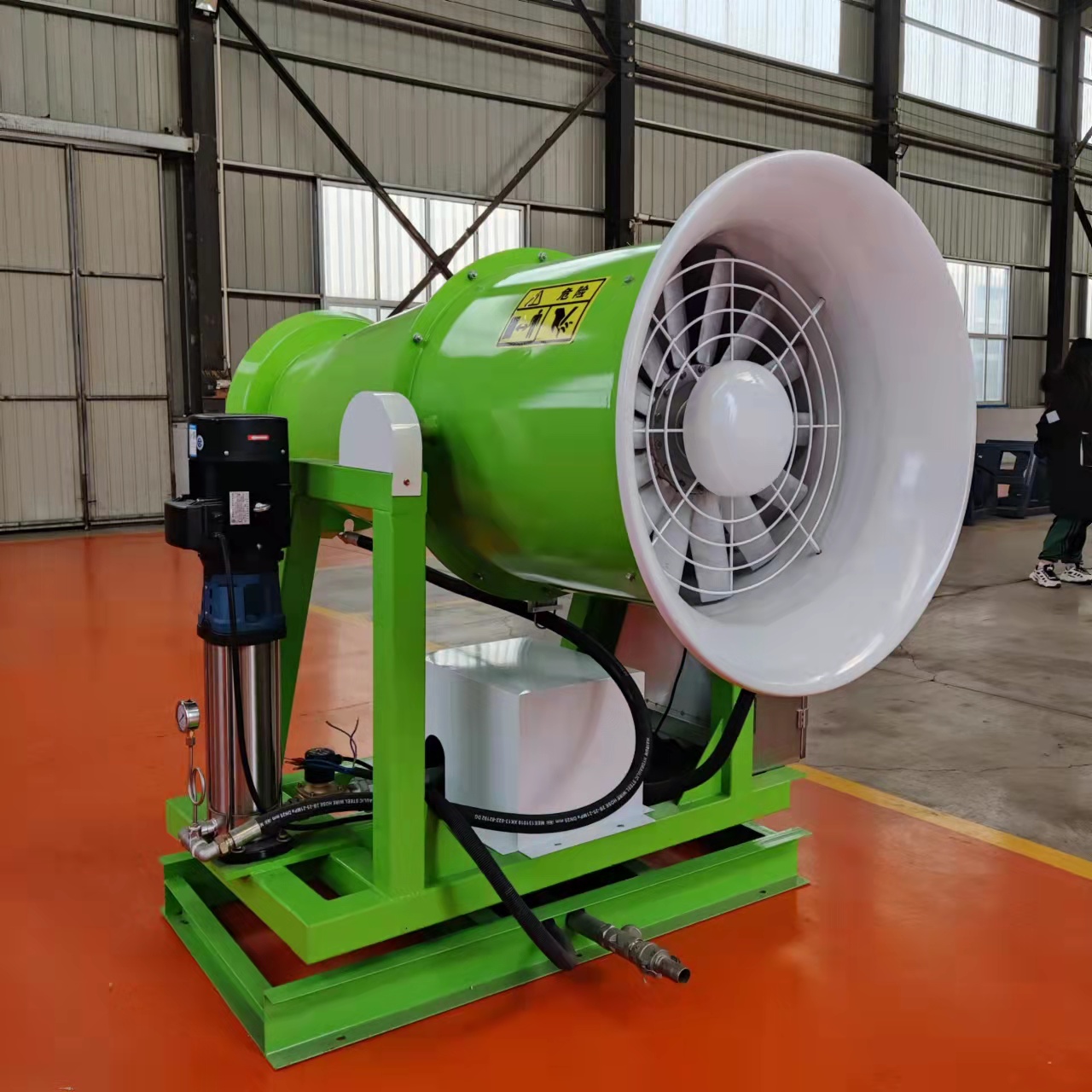 風送式噴霧除塵機噴霧壓力是指噴霧系統進行正常降塵作業時,流體流徑高壓霧化噴嘴處的壓力值。隨著水壓的不斷增大,霧滴直徑越小時,粉塵與霧粒的接觸面積 會相應增加,降塵效率也越好。但是,壓力過高也造成耗電多、器件易損壞,降低降塵裝置使用壽命,同時壓力過高也對供水管路的維護帶來困難,極易引起管路破損導致無法正常降塵作業。因此,在滿足降塵效果較好的前提下,需要控制降塵霧炮噴霧壓力,避免井下水資源浪費和零部件損耗。