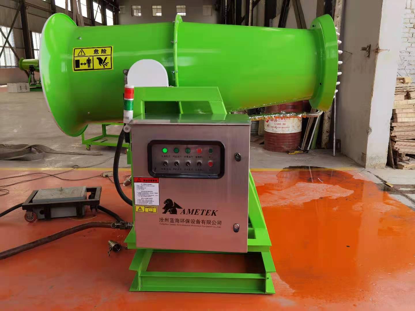 霧炮機生產廠家是根據風送原理,先使用高壓泵、微細霧化噴嘴將水化,再利用風機風量和風壓將霧化后的水霧送到較遠距離,使得水霧到達較遠距離同時能夠覆蓋 大面積,水霧與粉塵凝結后降落,從而達到降塵目的。 霧炮機對容易引起塵埃的堆場噴霧時,噴出的霧粒細小,與飄起的塵埃接觸時,形成一種潮濕霧狀粒,能快速將塵埃抑制沉降。 配套動力靈活,即可用380V的市電,也可配套發電機組供電。可安裝在混凝土平臺或鋼架平臺上,也可安裝在運輸車輛上。操作 ,進口遙控器100米距離內精 準操控,遠程電腦監控。功力強、射程遠、覆蓋范圍廣,可以實現定量、定時噴霧;工作效率高、噴霧速度快。耗水量相比其他抑塵噴灑設備可節約70%~80%(噴淋噴槍、灑水機車),且水霧覆蓋面積遠大于其他噴灑設備。