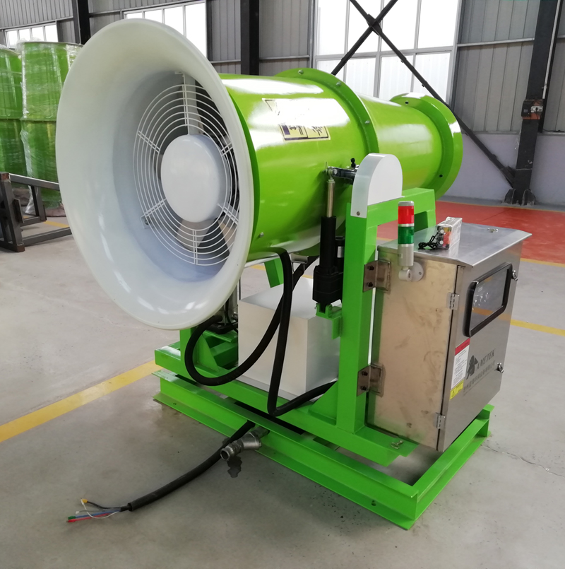 固定除塵霧炮機是根據風送原理,先使用進口高壓泵、微細霧化噴嘴將水霧化,再利用風機風量和風壓將霧化后的水霧送到較遠距離,使得水霧到達較遠距離同時能夠覆蓋 大面積,水霧與粉塵凝結后降落,從而達到降塵目的。