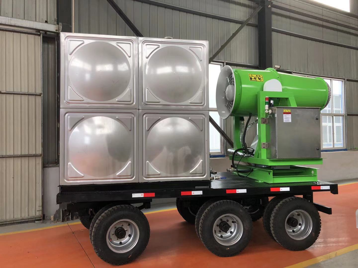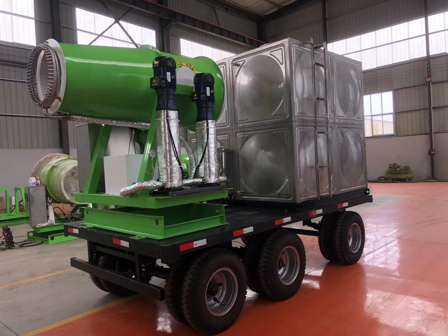 此款設(shè)備是移動(dòng)式的超細(xì)霧霧炮,有水箱(8m³)、拖車(chē)、霧炮組成。噴霧距離是60米,配備的南方泵業(yè)的雙泵,將設(shè)備連續(xù)工作時(shí)間延長(zhǎng)至24小時(shí)壓力能達(dá)到4Mpa,噴射出來(lái)的霧粒30微米。風(fēng)機(jī)采用的是18.5KW的節(jié)能降噪風(fēng)機(jī),整個(gè)設(shè)備啟動(dòng)起來(lái)噪音低于85db。這次的噴嘴要求也很?chē)?yán)格,達(dá)到了吹出來(lái)的霧落地不濕的效果。噴嘴嚴(yán)格那么過(guò)濾也得嚴(yán)格,水質(zhì)不好會(huì)堵塞噴嘴,整體設(shè)備單 配了一套過(guò)濾系統(tǒng)。還有自動(dòng)泄水功能,停機(jī)即自動(dòng)泄水。為了冬天 的使用,整體管路和水泵都做了嚴(yán)格的保溫設(shè)備。旋轉(zhuǎn)方面使用西門(mén)子plc系統(tǒng)單 控制設(shè)備的旋轉(zhuǎn),讓旋轉(zhuǎn)系統(tǒng)實(shí)現(xiàn)隨時(shí)左右擺動(dòng),告別限位開(kāi)關(guān)時(shí)代。配電系統(tǒng)采用的全進(jìn)口施耐德,保證了整體設(shè)備的運(yùn)行穩(wěn)定性。